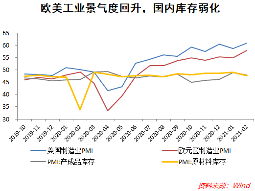 虽然生产似乎不及预期,但2021年1-2月规模以上工业企业利润大幅增长,除了2019年和2020年1-2月工业企业利润均为负增长带来了低基数效应,也不能忽视价格上涨、订单增加、供应能力回升以及利润率提高等因素。首先,工业品价格经历了明显上涨,且这种上涨主要源自于复苏中的工业品需求增长,而并非是上游成本推动。其次,就地过年使得来自国内外的订单能够得到及时的交付,转化为了真实的收入,需求持续增长带来了工业企业主动补库存,从而带动工业部门内部需求增加。再次,利润率也比去年同期有所回升,原因在于原材料提前购买价格低,工业品后续出售价格高,同时也反映了经历疫情后企业的投资需求更加审慎理性,客观上导致了利润增加。