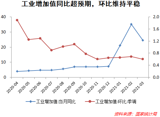 一季度,规模以上工业增加值同比增长24.5%,比2019年同期增长14.0%,两年平均增长6.8%。3月份,规模以上工业增加值同比增长14.1 %,低于预期,环比增长0.6%。但制造业增长15.2%,快于工业总体增速。需要注意的是,工业增加值的增速是排除了价格因素的实际增长。
