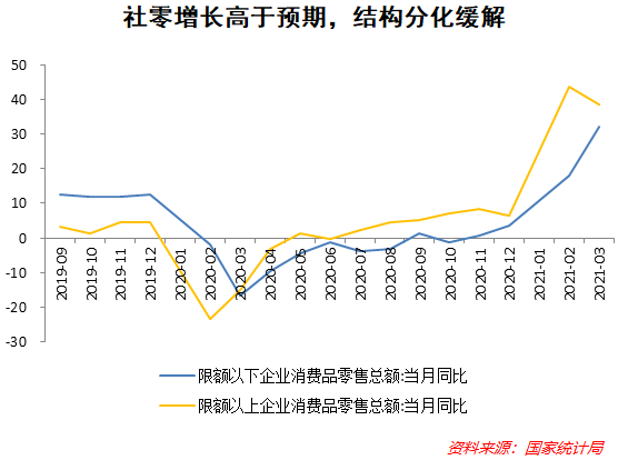 3月社零总额同比增长34.2%,比2019年同期增长12.9%,明显高于2月的6.4%。分化现象依然存在,限额以上企业零售额同比43.9%,限额以下零售同比28.9%。消费复苏总体平稳,限额以上企业消费品复苏快于限额以下的结构分化老问题也有所缓解。限额以上企业零售额同比38.6%,限额以下企业零售额同比32.3%,两者差距收窄。