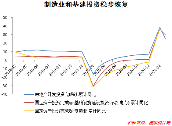 从三大投资领域(房地产、制造业和基建投资)来看,一季度势能总体良好。房地产开发投资同比25.6%,制造业投资同比29.8%,基建投资同比29.7%。前期结构分化的问题得到缓解,有赖于制造业和基建增速回升快于房地产投资。