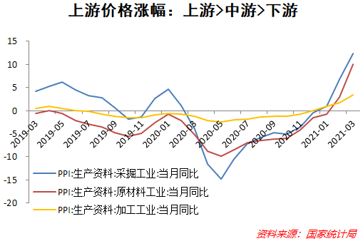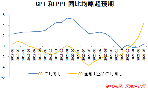 3月PPI同比涨4.4%,较上月幅度提高2.7个百分点,环比上涨1.6%,创2016年12月以来的新高。PPI超预期的原因,除了基数效应、翘尾因素、春节后生产增加等季节性因素以外(2020年3月PPI同比降1.5%),更多的是国内外工业部门需求增加的带动,尤其是来自国外的大宗商品价格上涨对国内的输入型压力较大。