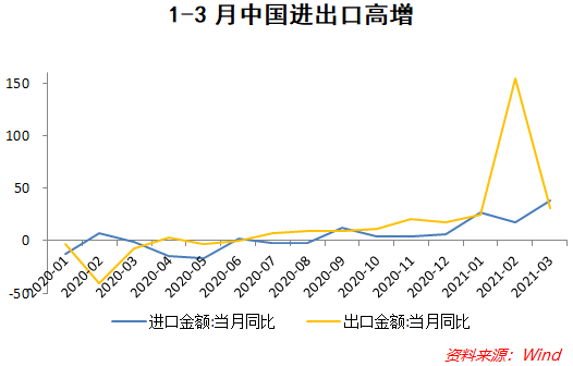 2020年下半年以来,中国外贸领域亮点颇多。一季度货物贸易进出口总值8.47万亿元人民币,比去年同期增长29.2%。其中,出口4.61万亿元,增长38.7%;进口3.86万亿元,增长19.3%;贸易顺差7592.9亿元,扩大690.6%。出口方面,低基数、海外工业和消费同步复苏、防疫物资出口持续是出口需求继续高增的主要原因,而就地过年、外贸企业春节假期期间继续开工保障了中国供应能力。进口方面,海外供应能力回升、中国工业和消费复苏带来的进口需求是两大原因。消费端,汽车、家电等限额以上的可选消费、大件消费复苏较好,带动欧盟、日本相关产品的对华出口;工业迅速复苏则带动集成电路、铁矿石等中上游工业品和资源进口,刺激巴西等资源出口国和新兴经济体出口,农矿产品价格抬升也提高了进口金额增幅。