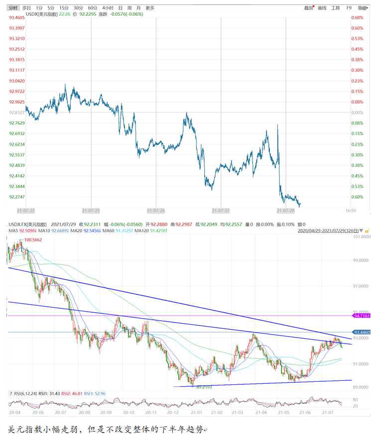 美联储7月会议决议整体略偏鹰,虽然美联储维持利率不变,维持购债规模不变;但是强调美国经济已经朝着缩减量化宽松的目标取得了进展,强调受疫情不利影响最重的部门已经出现好转,经济活动和就业指标继续走强。会议声明在措辞上偏鹰,释放了缩减购债规模的信号,即美国经济已经朝着缩减量化宽松的目标取得了进展,这为接下来的释放缩减购债规模信号和实施缩减购债规模措施释放了信号,故整体偏鹰,美元指数和美债收益率亦是短暂上涨。
