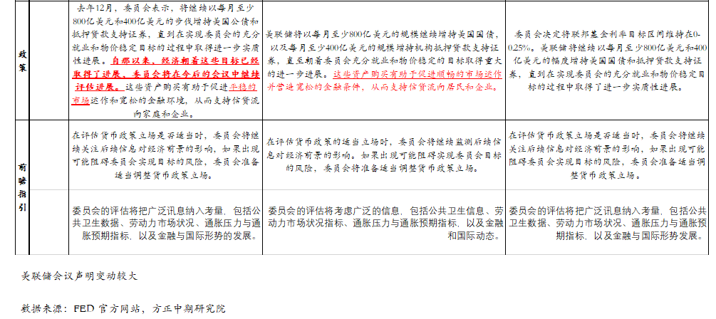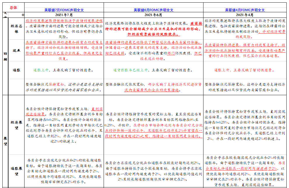 本次议息会议决议与以往所不同的主要在于,首次提出美国经济已朝着购债目标取得了进展,有待今后会议上继续评估;强调经济活动和就业指标继续走强等。具体来看,首次提出美国经济已朝着购债目标取得了进展,具体表述为“自去年12月决定继续以每月至少800亿美元的规模增持美国国债、以及每月至少400亿美元的规模增持机构抵押贷款支持证券以来,美国经济已经朝着充分就业和物价稳定的目标取得进展,委员会将在未来的会议上继续评估进展”,这肯定了购债的利好影响,并且开始为购债的效果达成与推出释放一定的信号。经济活动与就业方面,本次强调经济活动和就业指标继续走强,而不是6月份所说的“经济活动和就业指标已经走强”,再次肯定经济活动和就业指标的持续改善。疫情影响方面,本次强调“受疫情不利影响最重的部门已经出现好转,但还没有完全复苏”,这不同于6月会议“受疫情不利影响最重的部门仍然疲弱,但已经表现出好转”的表述,这强调了疫苗接种后经济活动持续复苏的肯定,但是亦强调了德尔塔变异病毒蔓延的影响。经济发展路径方面,强调经济发展路径继续取决于疫情的发展,而不是6月“经济发展路径将在很大程度上取决于疫情的发展”的表述,这再次说明了变异病毒对经济的影响依然存在。