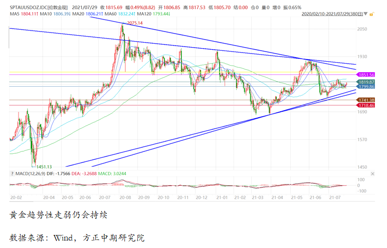 美元指数:二季度末开始,美联储官员不断发出缩减购债规模的言论,美联储紧货币政策收紧的预期持续上涨,美元指数亦低位反弹,持续走升。当前,美联储货币政策转向没有释放进一步的信号,所以美元指数跟随美债收益率有所走弱,但是美联储在三季度释放缩减购债规模信号、并在四季度实施缩减购债措施的货币政策整体预期,将会持续美元指数继续反弹,我们认为下半年美元指数整体偏强, 2021年下半年突破93.44后,涨至94.7-95的可能性依然比较大。