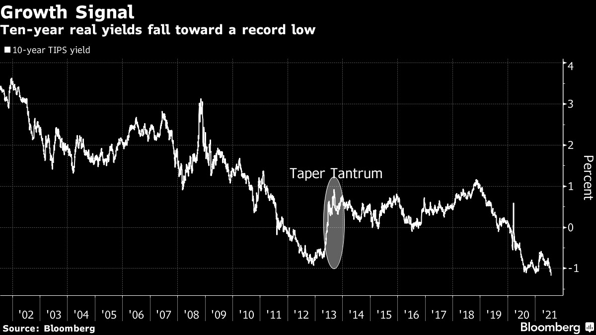 美联储会议结束后,10年期美国国债收益率一度下跌1.7个基点至1.22%,从3月底收益率1.77%的一年期高点开始一路下跌。更引人关注的是,被一些投资者视为长期增长前景代表的10年期实际收益率跌至负1.17%的历史新低。