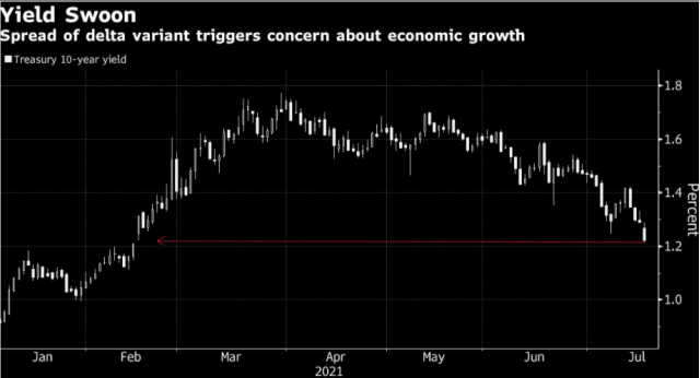 新冠变异毒株delta引发投资者对经济增长的担忧,伴随美国国债大涨,周一(7月19日)10年期国债收益率自2月以来首次跌破1.2%,一度下跌至1.172%,远低于3月触及的14个月高位1.77%。新冠疫情反弹促使投资者回避风险,因猜测新一轮防疫封锁将抑制经济活动。