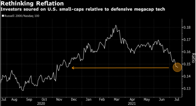 美国和其他国家的新冠病例迅速增加,加剧了人们对疫情再度加重的担忧,并在全球股市引发了冲击波。下图显示相对防御性强的大型科技股,美国投资者对小型股兴趣大减: