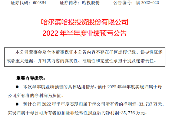 哈投股份2022年上半年预计亏损3.37亿同比由盈转亏主营业务成本增加 - 挖贝网