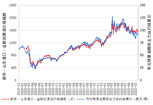 数据来源:新华指数、金联创山东港口进口原油到岸价格指数包含新华·山东港口·金联创原油价格指数(SPG CIPI)和山东港口进口原油到岸贴水估价,由中国经济信息社联合山东省港口集团、金联创共同编制并发布。其中,山东港口进口原油到岸贴水估价是统计2个月后到港原油的交易贴水,综合反映山东港口原油现货市场交易情况。SPG CIPI以山东港口进口原油到岸贴水估价为基础,综合各种不同进口原油的比重编制而成,直观反映了山东港口进口原油实际进口成本的变化趋势。
