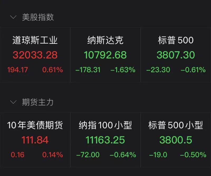 截至收盘,道琼斯指数涨0.61%,报32033.28点;标普500指数跌0.61%,报3807.30点;纳斯达克指数跌1.63%,报10792.67点。