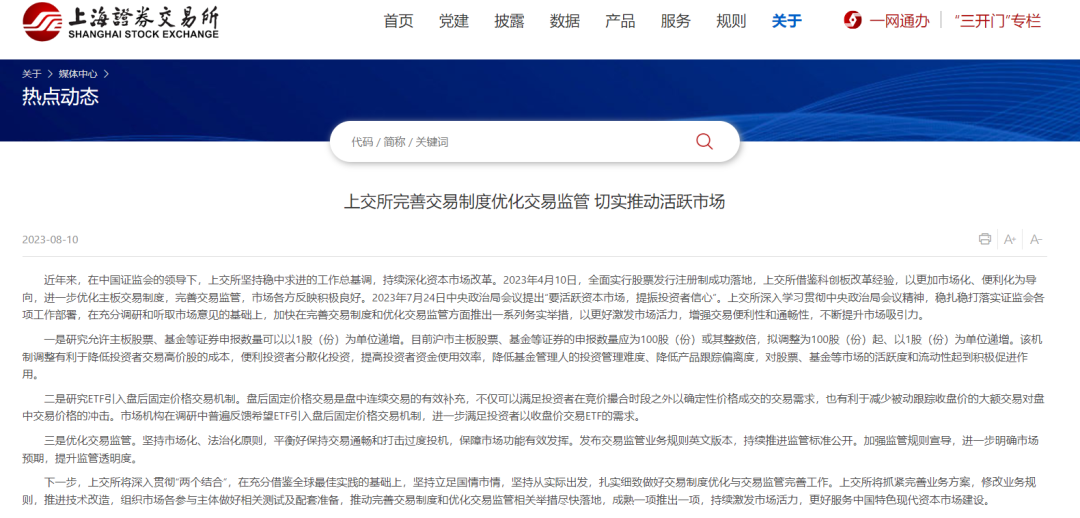 近年来,在中国证监会的领导下,上交所坚持稳中求进的工作总基调,持续深化资本市场改革。2023年4月10日,全面实行股票发行注册制成功落地,上交所借鉴科创板改革经验,以更加市场化、便利化为导向,进一步优化主板交易制度,完善交易监管,市场各方反映积极良好。2023年7月24日中央政治局会议提出“要活跃资本市场,提振投资者信心”。上交所深入学习贯彻中央政治局会议精神,稳扎稳打落实证监会各项工作部署,在充分调研和听取市场意见的基础上,加快在完善交易制度和优化交易监管方面推出一系列务实举措,以更好激发市场活力,增强交易便利性和通畅性,不断提升市场吸引力。